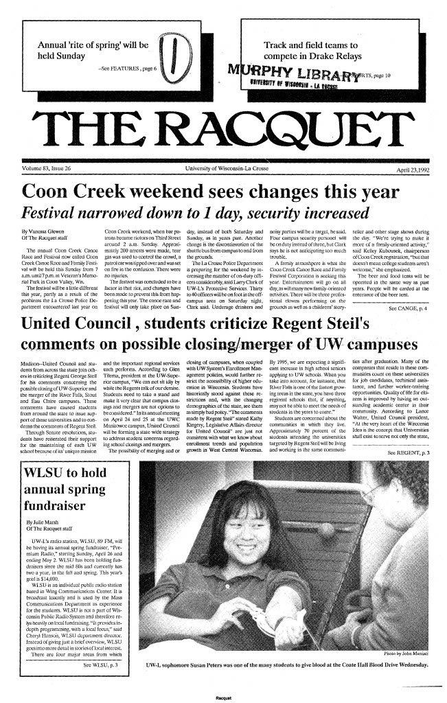 The Racquet Newspaper Collection contains over 2,300 issues of this publication. Originally published by the La Crosse Normal School beginning in 1910, this student newspaper has stood the test of time, as it remains a paper publication on campus to this day. Written by the students and for the students for over 100 years, this collection provides unique insight into the ever-changing student population, as well as students' reactions and interpretations to local, national, and global events over the past century. New issues are added on an annual basis.