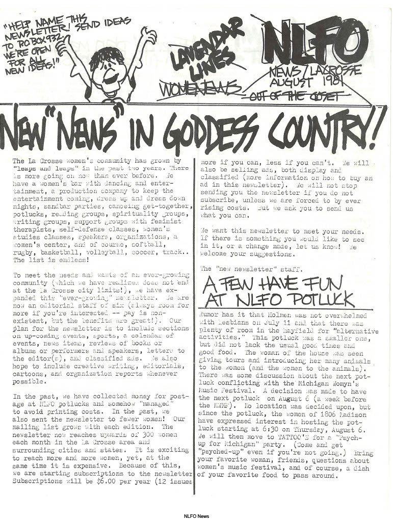 The Leaping La Crosse News (LLN) publication served as a source of information for lesbians living in the La Crosse, Wisconsin, area. It was published from 1979 to 2007 and distributed monthly. Topics covered in the newsletter include national, state, and local news about lesbian activities, legal cases, fashion, entertainment, and events, as well as social and political activities of La Crosse area lesbians. This collection includes nearly every published issue, amounting to 317 separate issues.