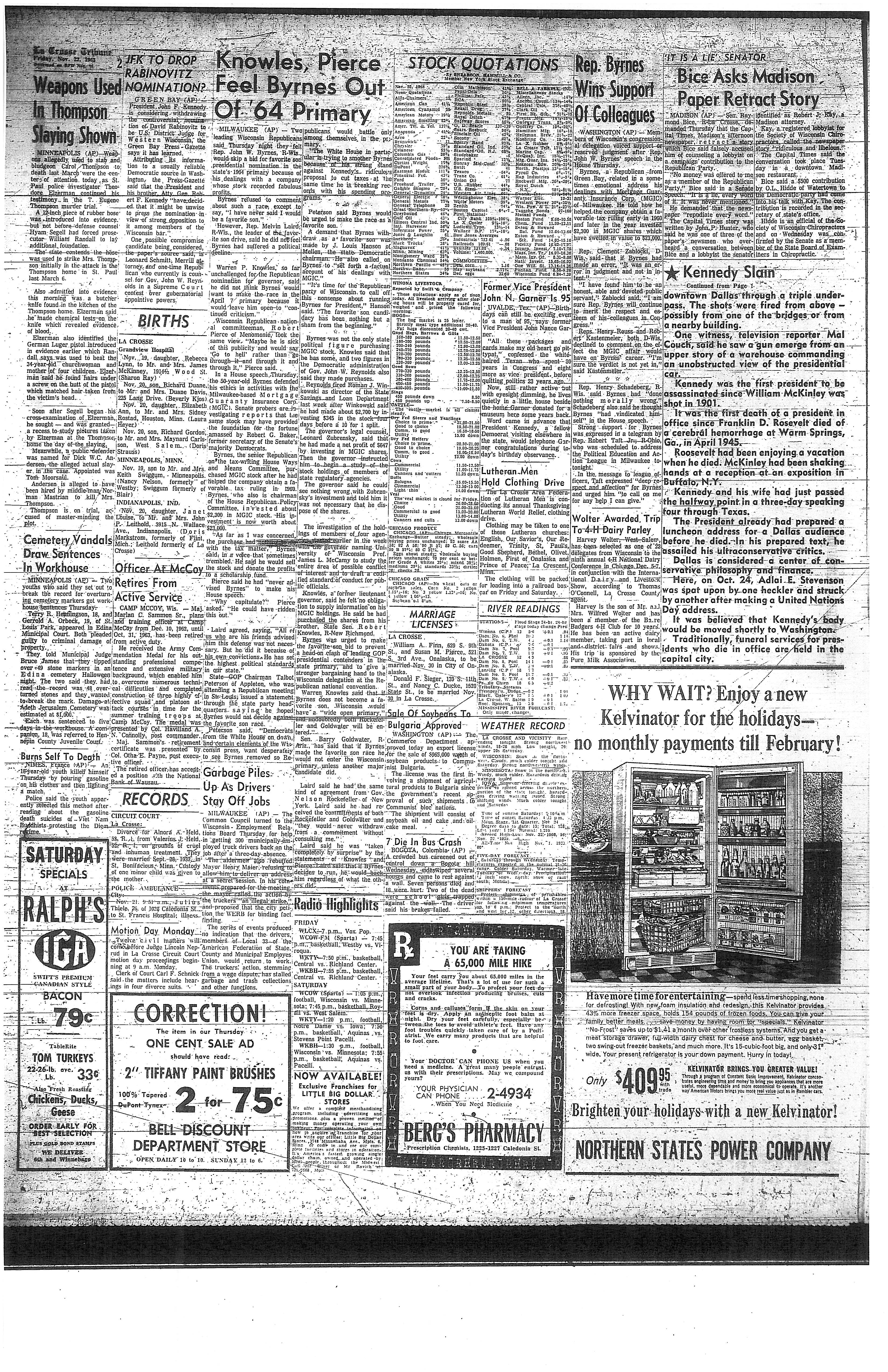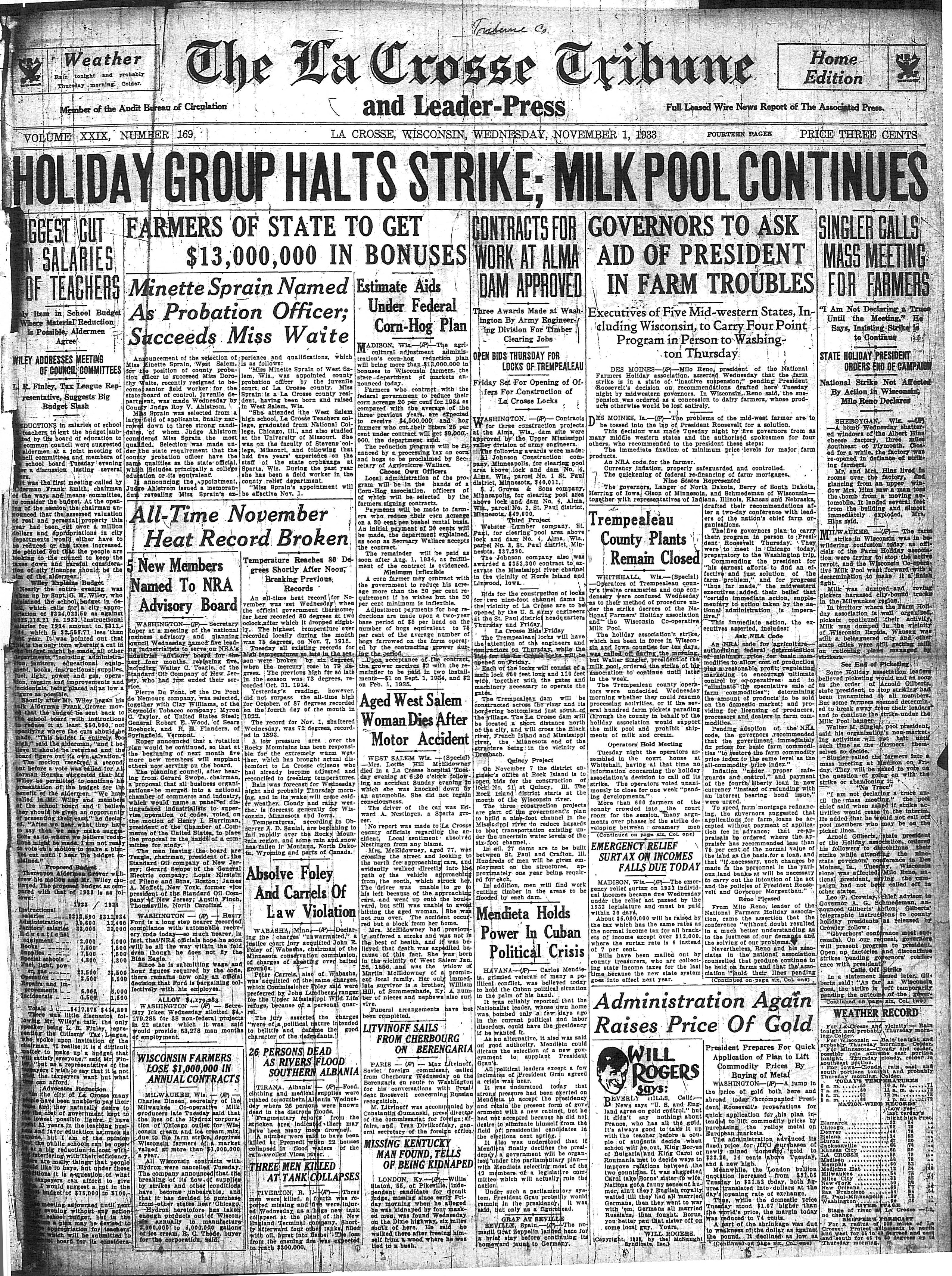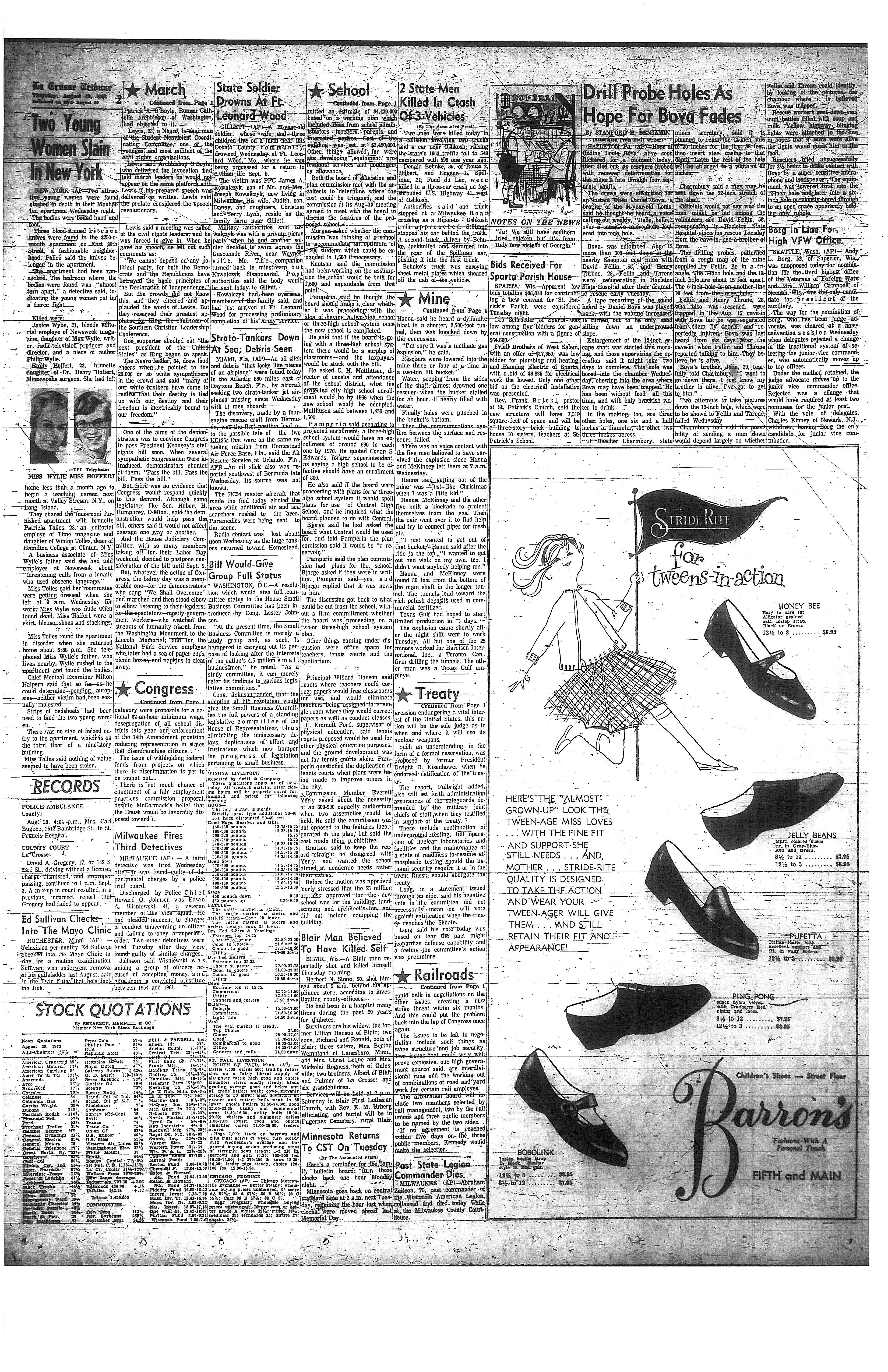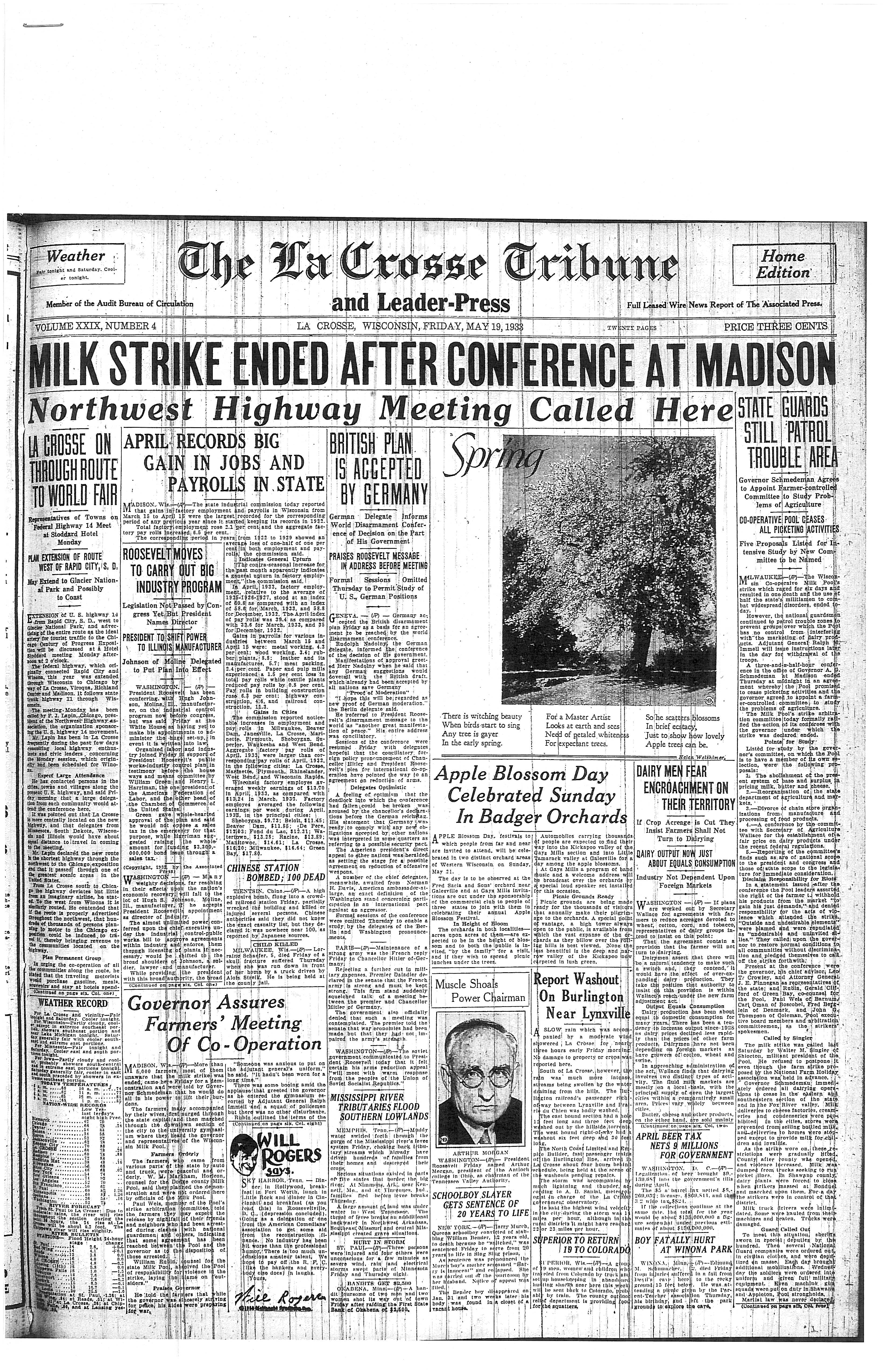 January 9, 1940, page 4 March 31, 1940, page 7 April 7, 1940, page 2April 14, 1940, page 5April 16, 1940, page 11April 17, 1940, page 16November 20, 1940, page 2November 26, 1940, page 14October 13, 1962, page 2October 16, 1962, page 9October 12, 1963, page 3 (insert)October 19, 1963, page 1 (insert)October 25, 1963, page 7March 4, 1972, page 22 September 20, 1984, page 19 October 7, 1984, page 11 February 5, 1987, page 1, part 1 February 5, 1987, page 8, part 2Milk Strike of 1933