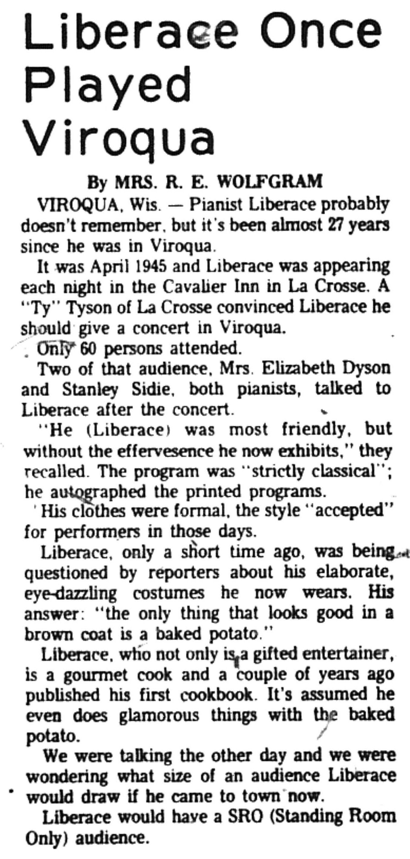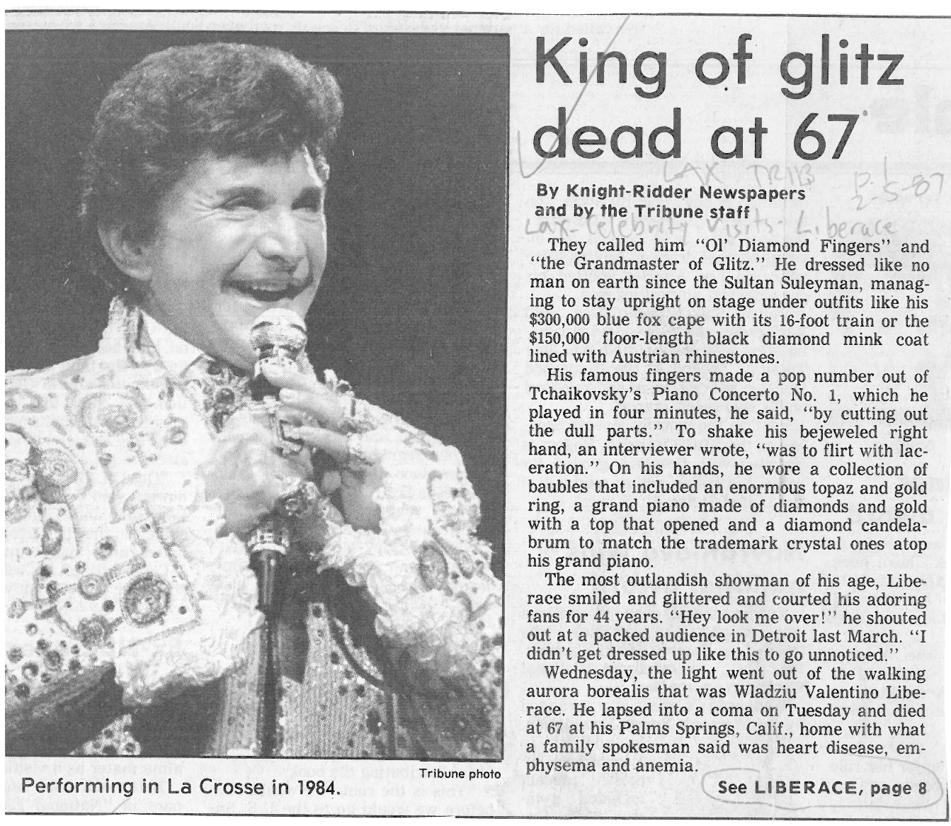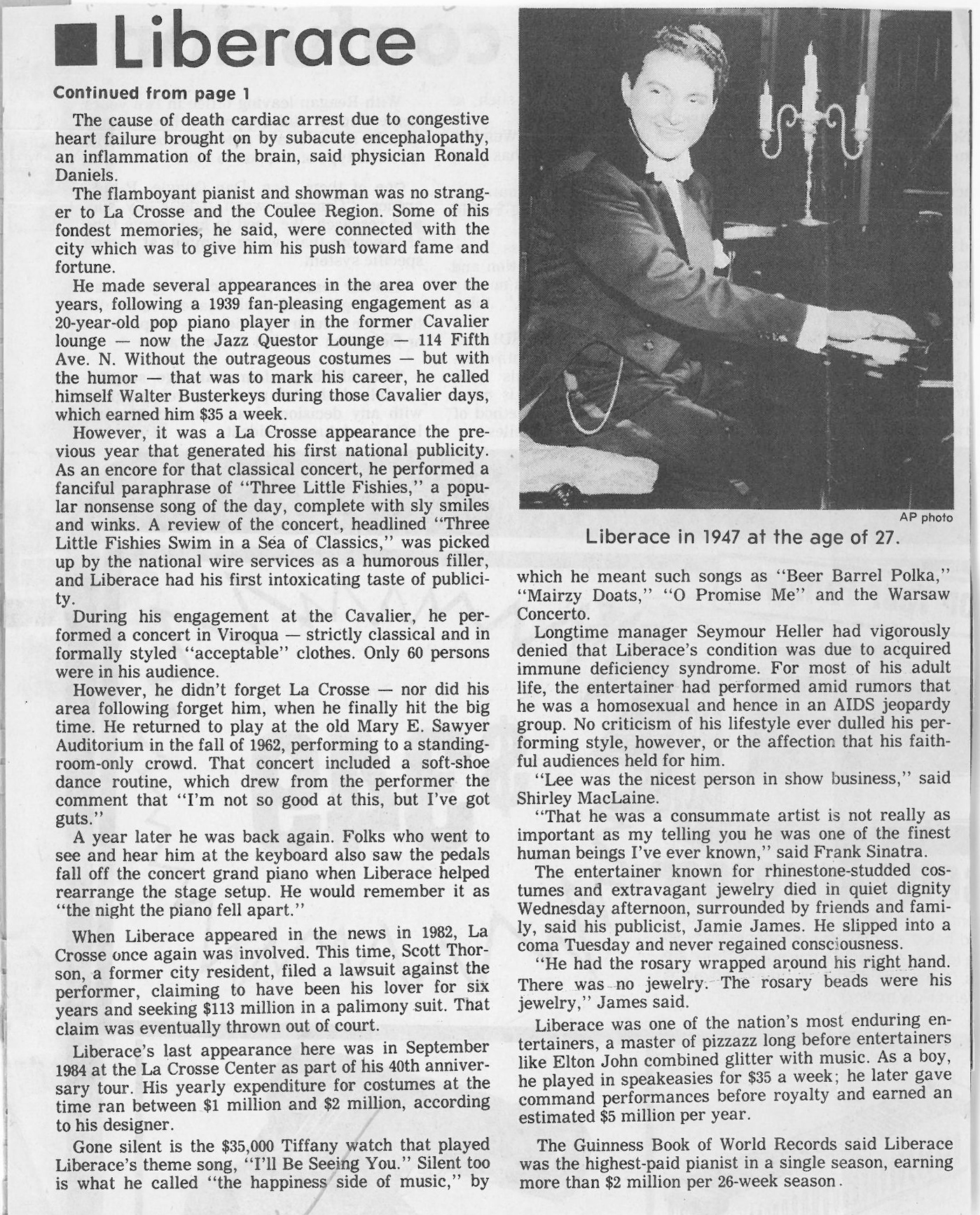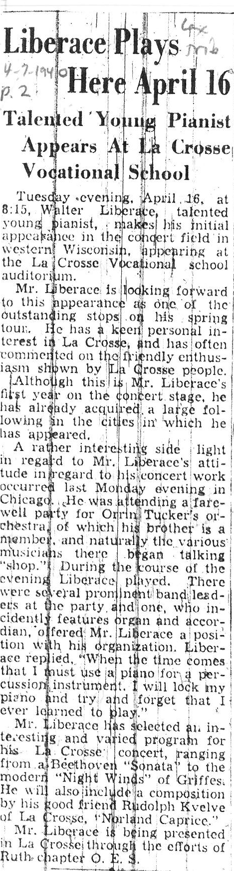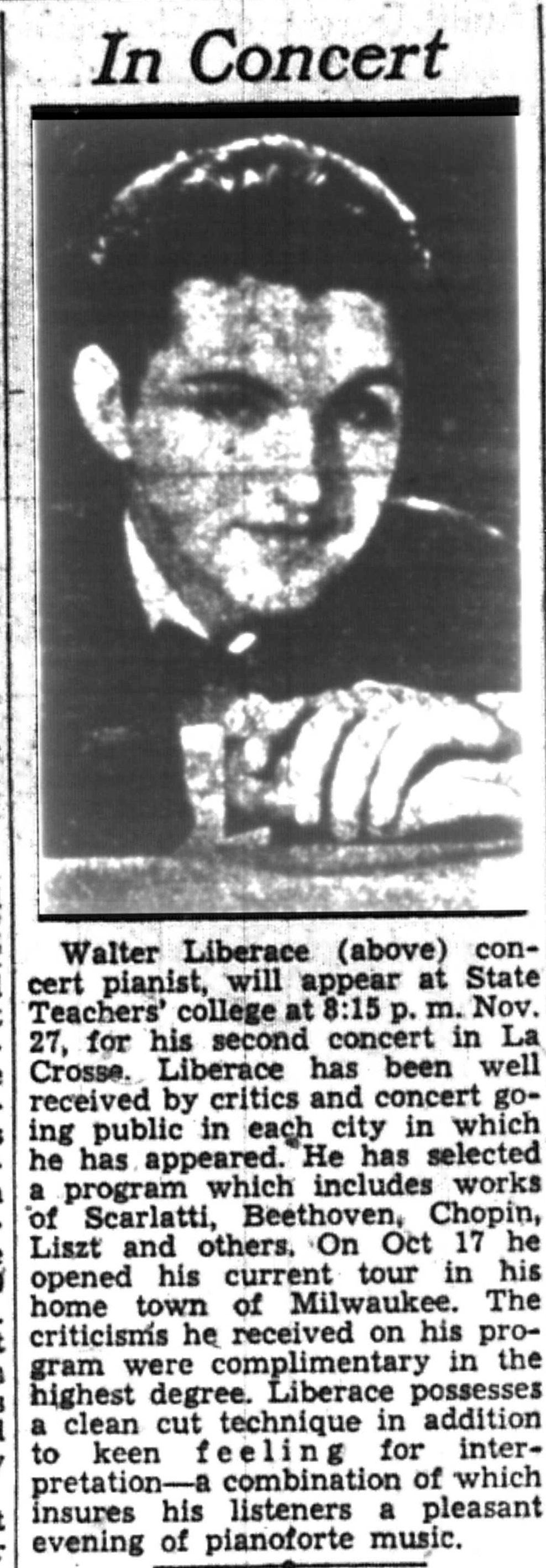 August 3, 1936, page 7 August 4, 1936, page 7 August 5, 1936, page 10 August 9, 1936, page 10 May 3, 1955, page 14 May 4, 1955, page 17Liberace