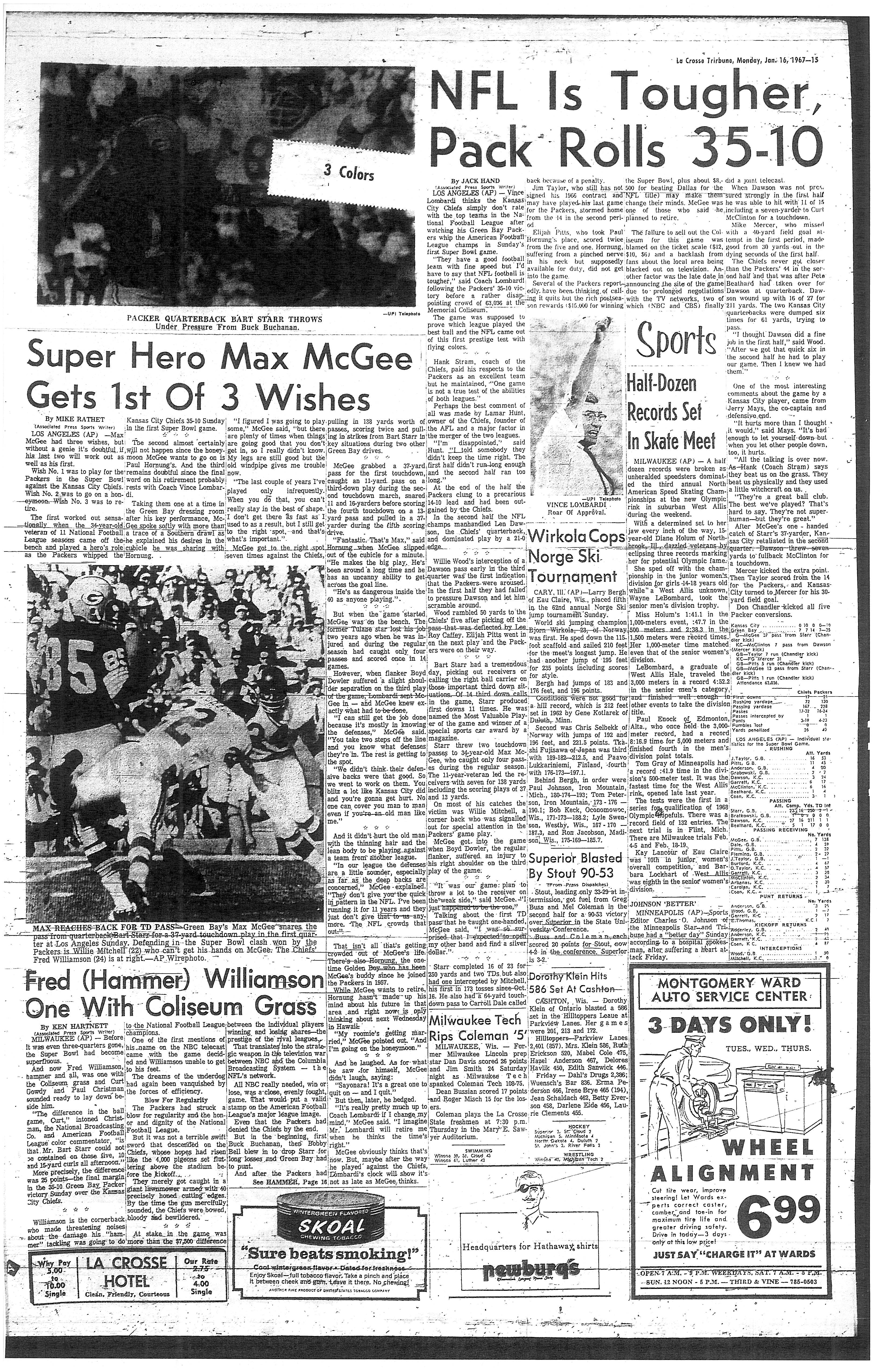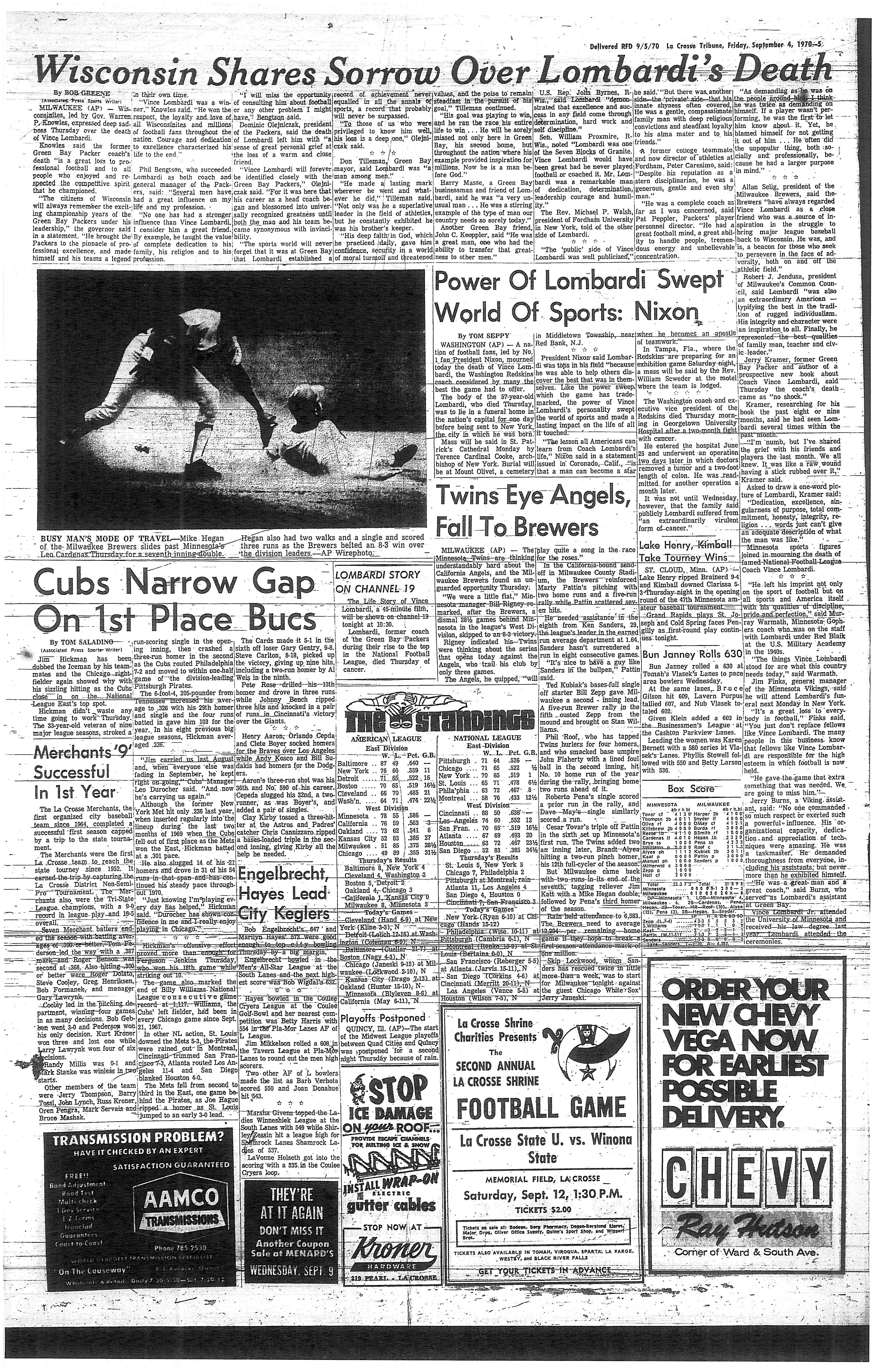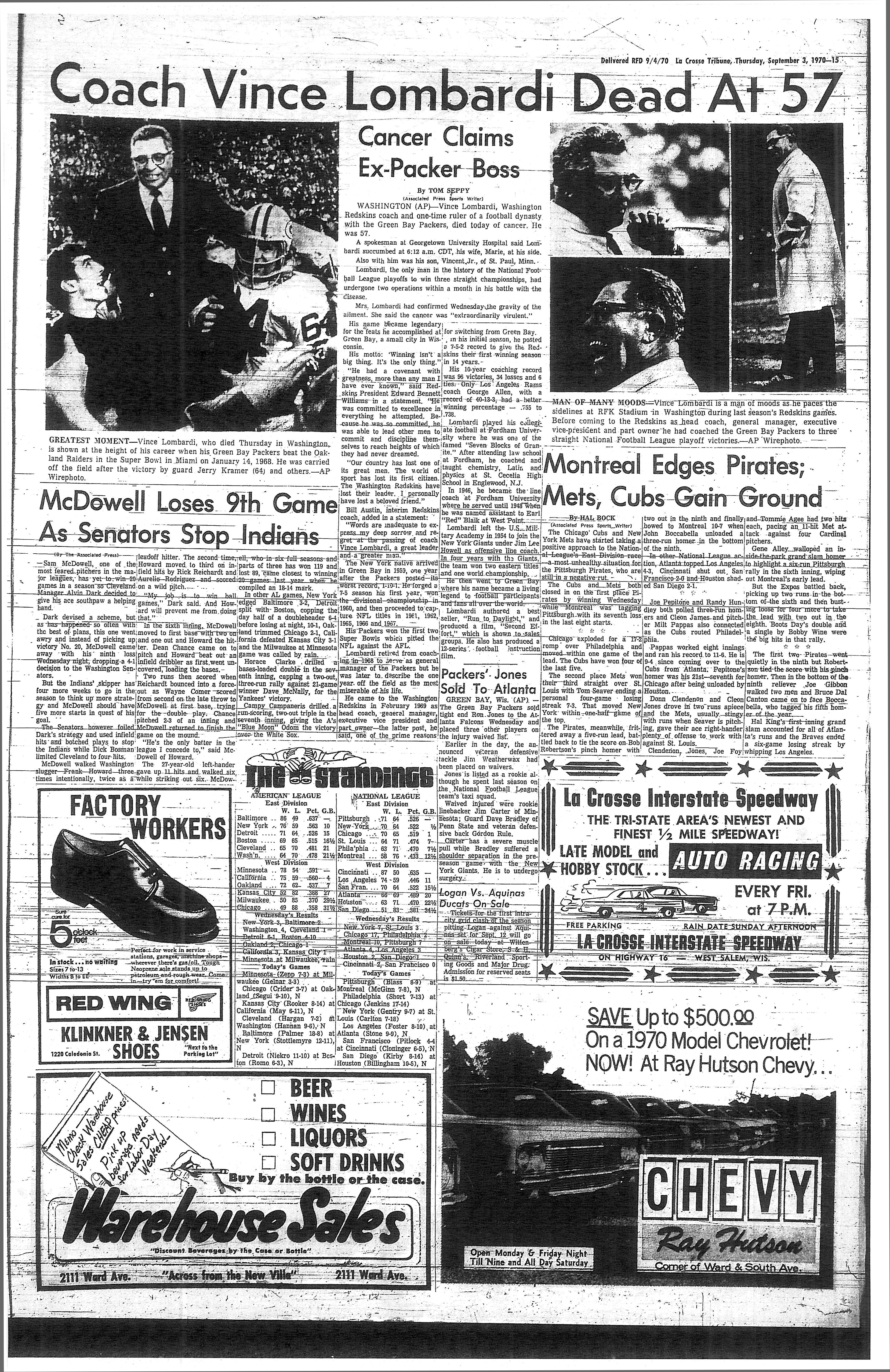 November 19, 1990, page A-6 September 21, 1997, page C-4 September 22, 1997, page A-1 September 22, 1997, page A-6 October 8, 1998, page C-1 October 11, 1998, page A-1 October 11, 1998, page A-6 December 10, 1999, page A-1 December 10, 1999, page A-8 August 29, 2008, page B-1Vince Lombardi