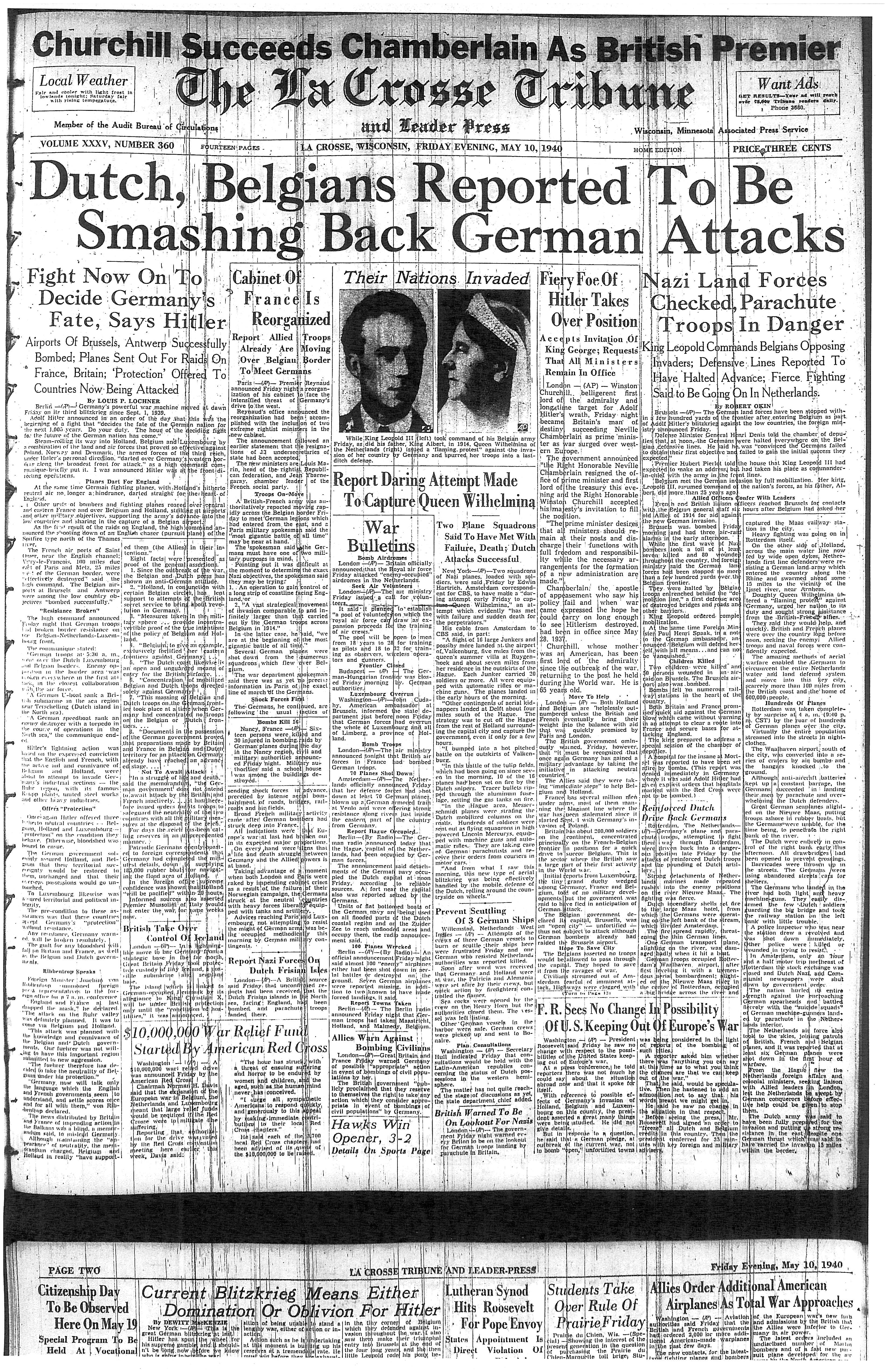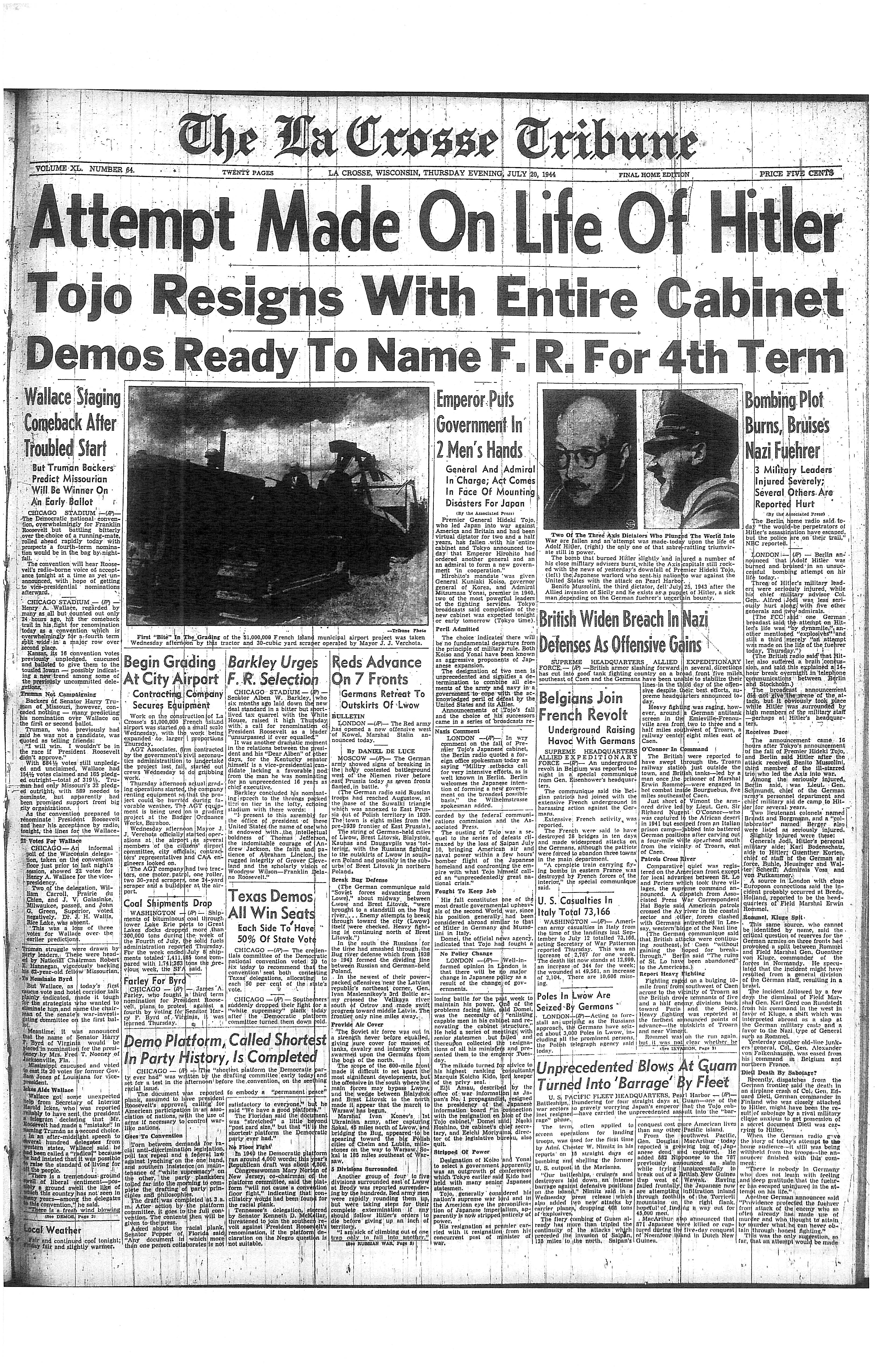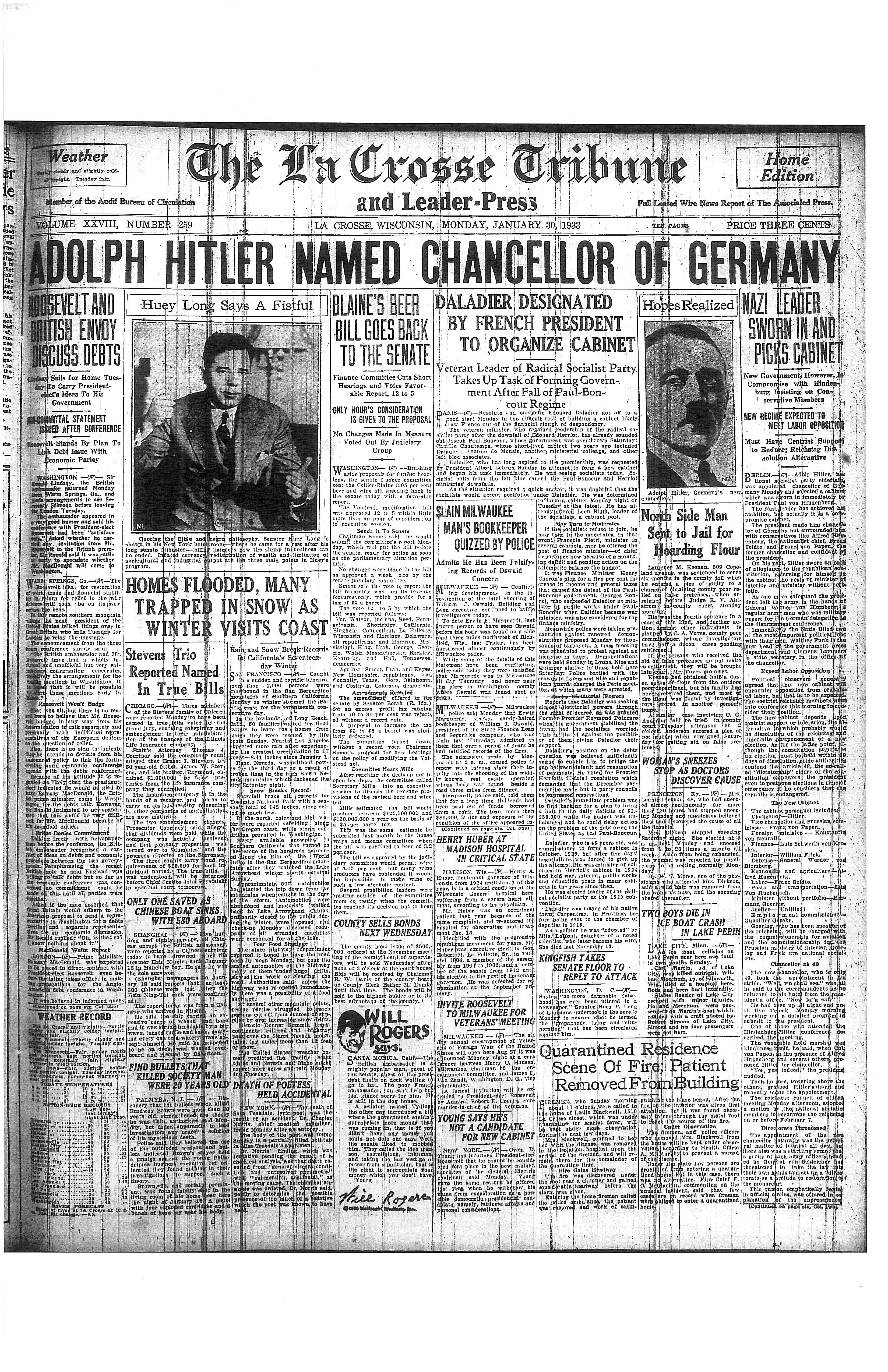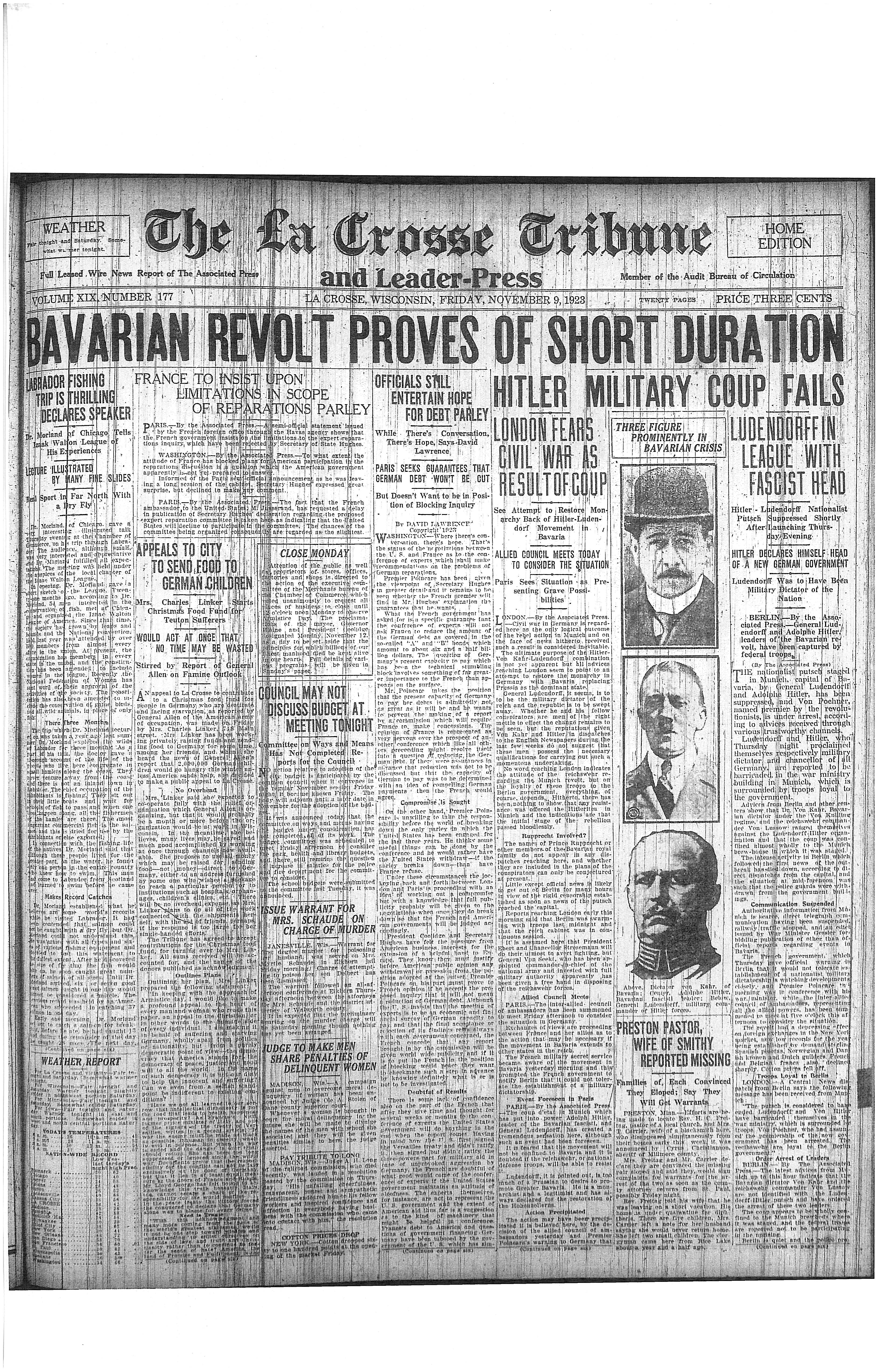 November 9, 1923, page 1, part 1 November 9, 1923, page 6, part 2 January 30, 1933, page 1, part 1 January 30, 1933, page 6, part 2 July 20, 1944, page 1, part 1 July 20, 1944, page 2, part 2 May 1, 1945, page 1World War II — Kristallnacht
