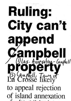 About These Materials This grouping of articles highlights the ongoing discussion between the Town of Campbell and the City of La Crosse regarding annexation, boundaries, efforts to cooperate, and public services such as water. Since 1983, the city has tried to actively encourage Campbell residents to annex to the city. A court decision in 2002 over annexation led to a split: the city of La Crosse gained some properties on Hiawatha Island, a small island east of French Island, while ruling that annexation into French Island itself was invalid. Also, several moves to incorporate as a village began as early as 1966, with the most recent effort as late as 2002.