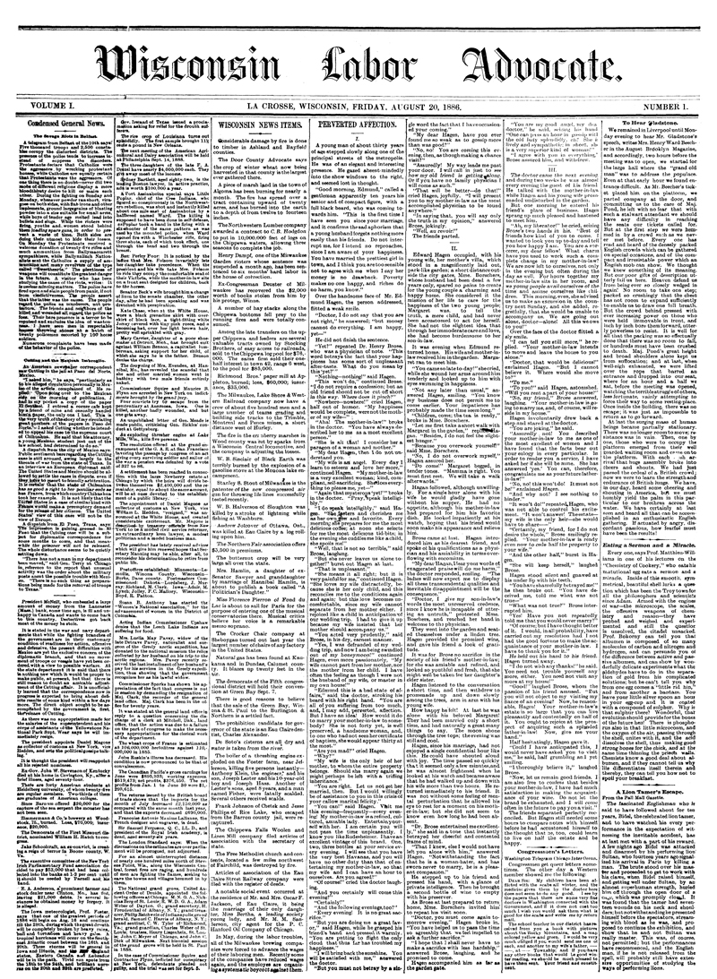 This collection includes the newspaper and its transcriptions. The Wisconsin Labor Advocate was a newspaper published in La Crosse in 1886-1887 with political and financial backing from Dr. D. Frank "White Beaver" Powell. La Crosse was a hotbed of Labor political party activity in the 1880s and the Wisconsin Labor Advocate was one of at least four La Crosse area Labor-related newspapers from that time. What makes the Wisconsin Labor Advocate unique was its editor and owner: George Edwin Taylor. Taylor was an African-American, born in Arkansas in 1857. As a black business owner, he was an anomaly in La Crosse, Wisconsin, in the 1880s. Taylor got his start in publishing working at other La Crosse newspapers. He also became increasingly interested in politics as reflected in his editorship of the Wisconsin Labor Advocate. The last existing edition of the paper dates from August 6, 1887 and George Edwin Taylor left La Crosse soon afterwards. He maintained a life-long interest in politics and by 1904 had become involved in an all African-American political party called the National Liberty Party. Taylor accepted the nomination of that party in 1904 as its candidate for the office of the U.S. President. In doing so, Taylor was the first candidate of a national African-American party for the U.S. presidency.