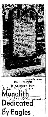 Newspaper articles related to the controversy of a ten commandments monument located in a public park in La Crosse, Wisconsin. The Ten Commandments Monument was donated to the city and dedicated in Cameron Park in conjunction with a state Eagles Club convention held in La Crosse in 1965. Seen as a religious symbol on public property, a lawsuit in 1985 sparked a court battle between the Freedom From Religion Foundation, led by Anne Gaylor, and the city. The case was dismissed in 1988. The issue resurfaced in 2001 with more local citizen support, and the city sold the small parcel of land where the monument stands to the Eagles Club in 2002.