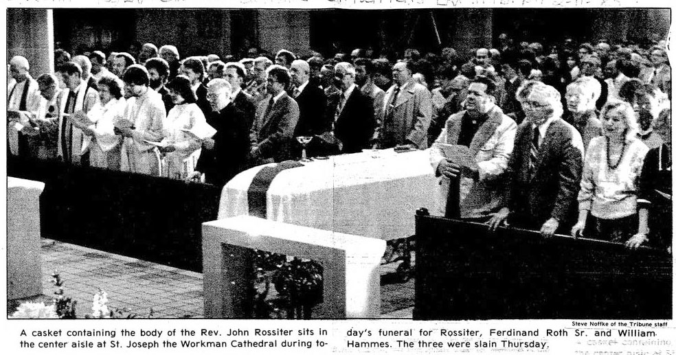 Newspaper articles related to the killing of three people at a church in Onalaska, Wisconsin. On the morning of February 7, 1985, Bryan Stanley, 29, shot and killed Father John Rossiter, lay minister Ferdinand Roth and parish custodian William Hammes at St. Patrick's Catholic Church in Onalaska. Stanley had a deep interest in religion and when picked up by police near the crime scene he told officers that he was Elijah. He was allegedly upset that Father Rossiter allowed girls to read the Scriptures during Mass as the pope authorized. In the end, Stanley was judged insane and not legally responsible for the slayings.
